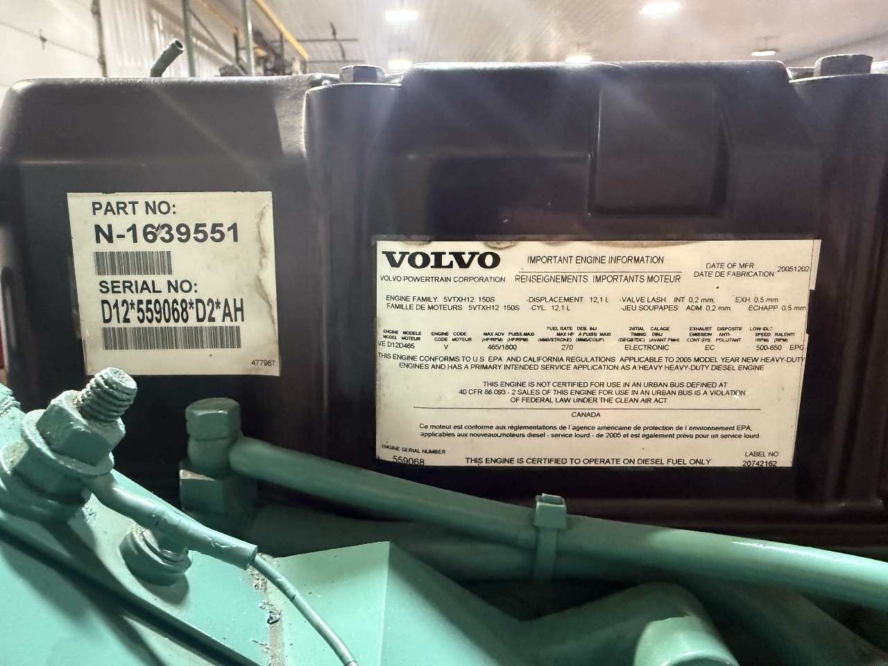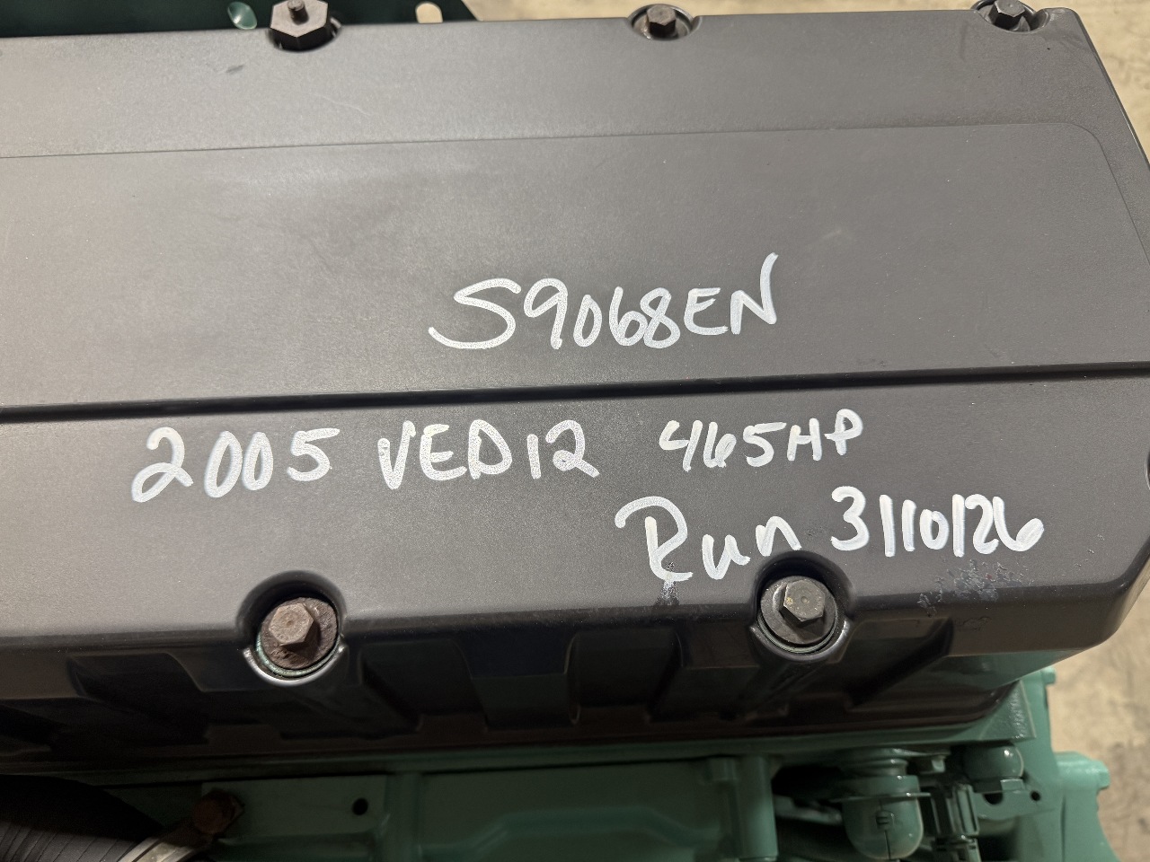 USED 2005 VOLVO VED12 ENGINE ASSEMBLY FOR SALE. S/N 559068 465HP EGR ENGINE TESTED, INSPECTED, RUN TEST 3/10/26 - RUNS EXCELLENT! WATCH VIDEO OF RUNNING ENGINE FOR MORE INFORMATION PLEASE CALL 800-738-7802 PRICE: $6500 EXCHANGE STOCK# S9068EN