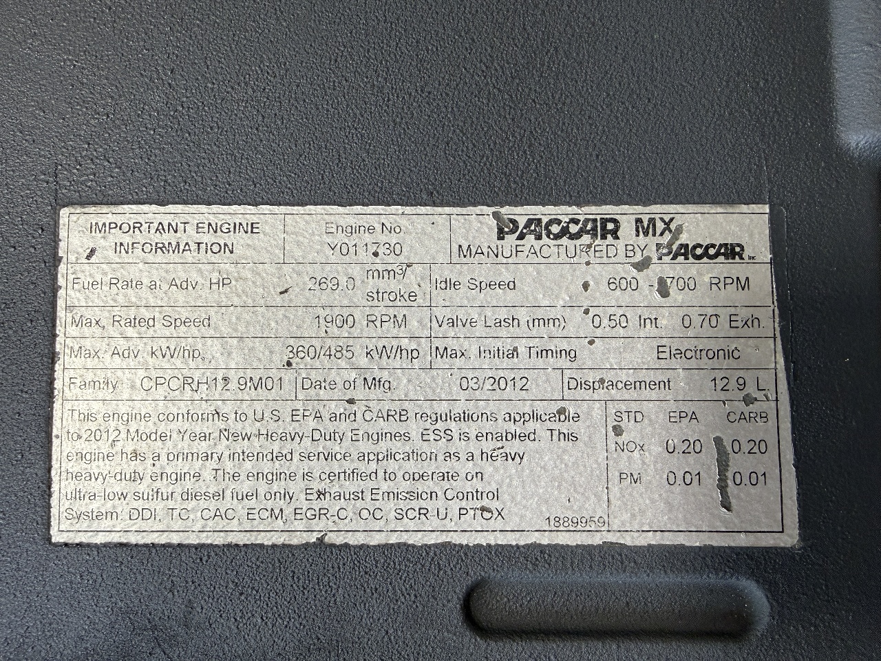 Used 2012 Paccar MX13 Diesel Engine for Sale * S/N Y011730 * Family# CPCRH12.9M01 * 485HP * EPA10 * Tested, Inspected, Run Test 7/15/26 - Engine runs EXCELLENT!!! For more information please call 800-738-7802 * Inventory changes daily, please call for availability!!! Stock # S1730EN
