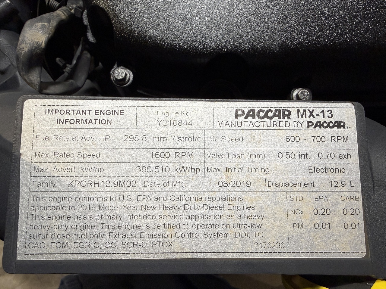 USED 2019 PACCAR MX13 DIESEL ENGINE FOR SALE 2019 PACCAR MX13 510HP S/N Y210844 FAMILY# KPCRH12.9M02 TESTED, INSPECTED, RUN TEST 10/15/25 - WATCH VIDEO OF RUNNING ENGINE - RUNS EXCELLENT PRICE: $17500 EXCHANGE STOCK# S0844EN