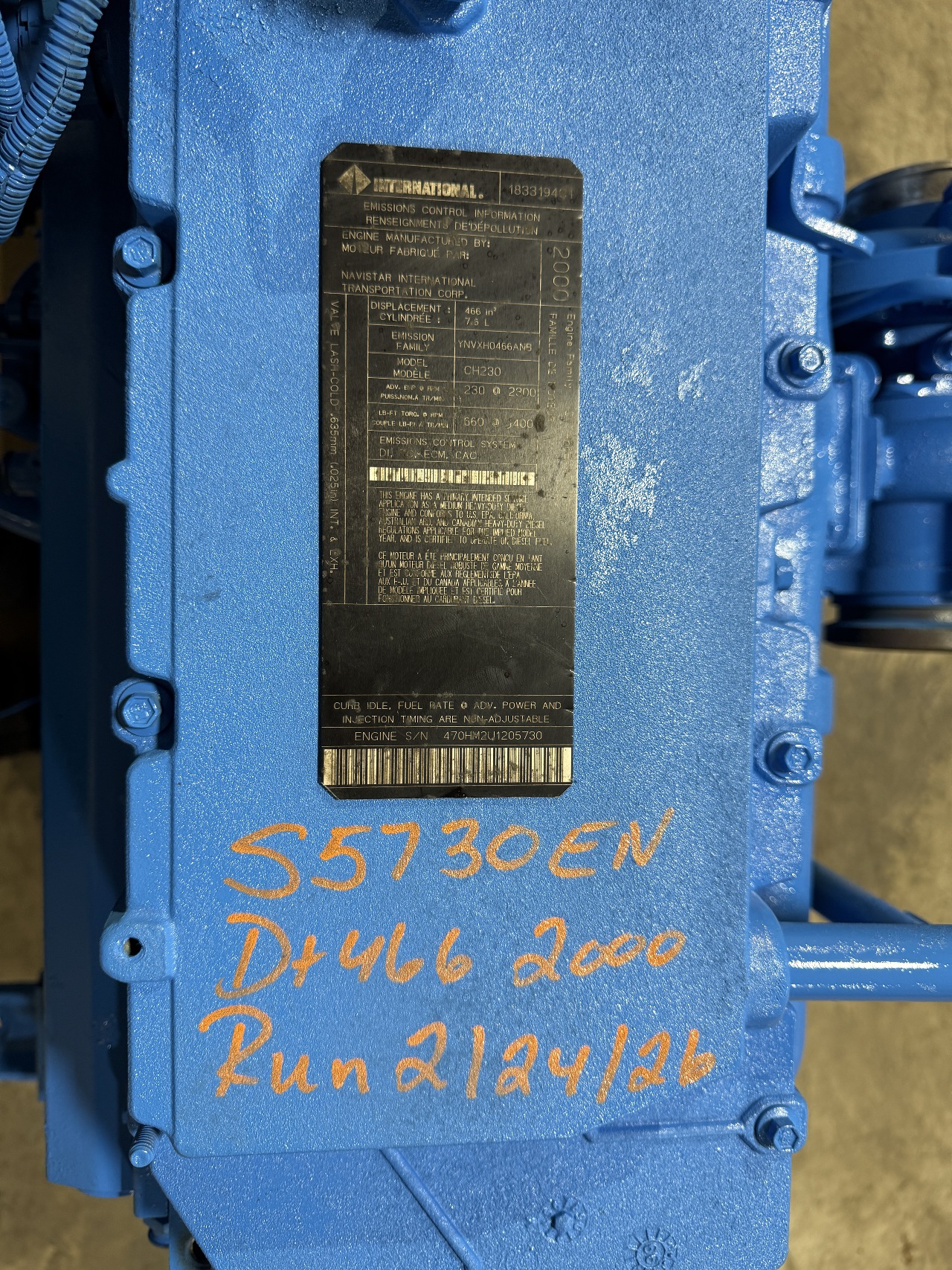 USED 2000 INTERNATIONAL DT466 ENGINE FOR SALE S/N 470HM2U1205730 230HP EPA2000 ECM DRIVER SIDE HIGH FRONT TESTED, INSPECTED, RUN TEST 2/24/26 - RUNS GREAT!! WATCH VIDEO OF RUNNING ENGINE FOR MORE INFORMATION PLEASE CALL 800-738-7802 STOCK# S5730EN PRICE: $5500 EXCHANGE