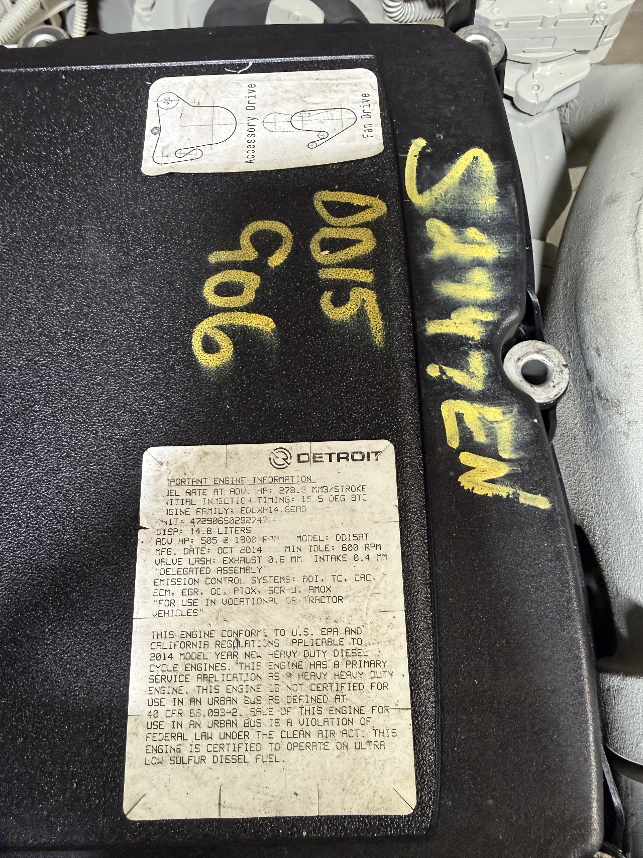 USED 2014 DETROIT DD15 ENGINE FOR SALE S/N 472906S0292747 505HP EPA13 TESTED, INSPECTED, RUN TESTED FOR MORE INFORMATION PLEASE CALL 800-738-7802 STOCK# S2747EN